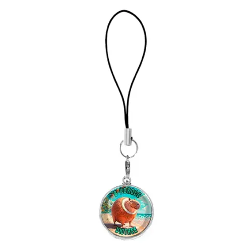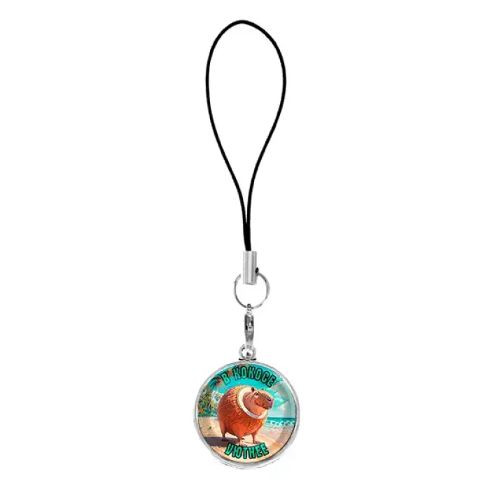 Подвеска-брелок для телефона из бижутерного сплава под серебро с изображением под выпуклой стеклянной линзой.