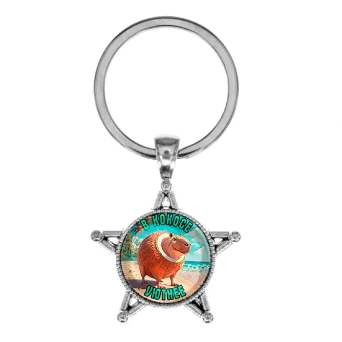 Брелок для ключей в виде звезды из бижутерного сплава со стеклянной линзой.