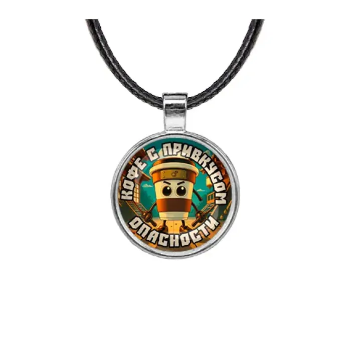 Кулон «Капучино Ассасино» из бижутерного сплава со стеклянной линзой и шнурком.