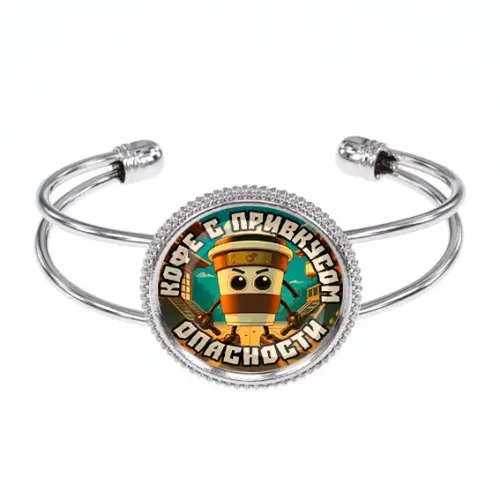 Бижутерный браслет с покрытием под серебро и декоративным элементом под стеклянной линзой.