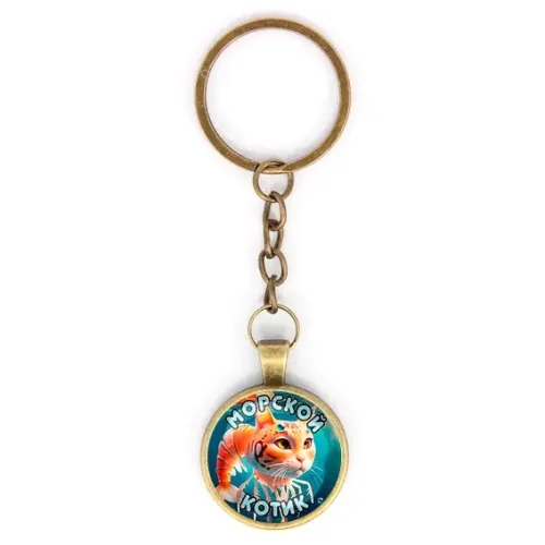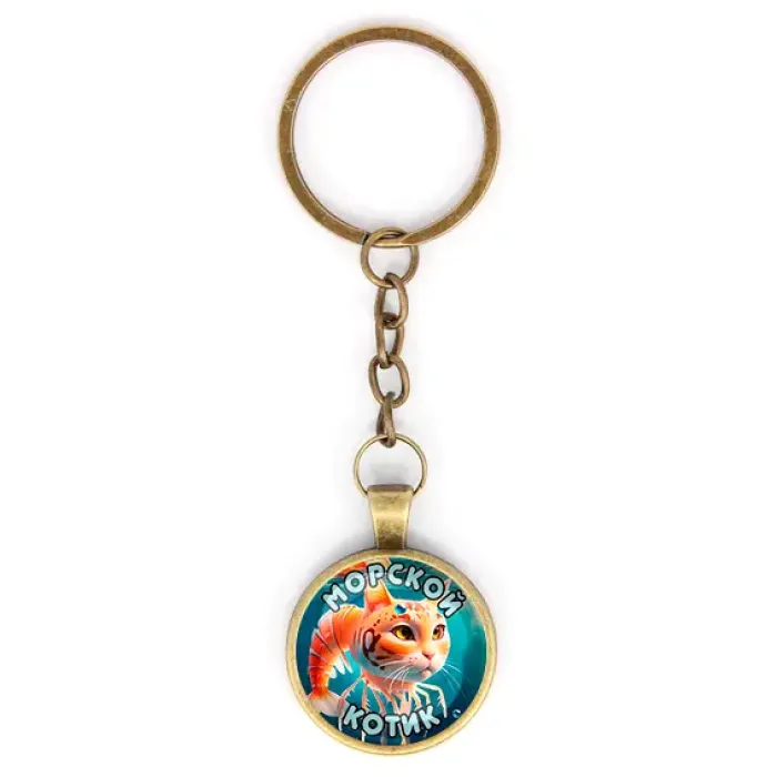 Круглый брелок из бижутерного сплава с бронзовым покрытием и защитным стеклом.