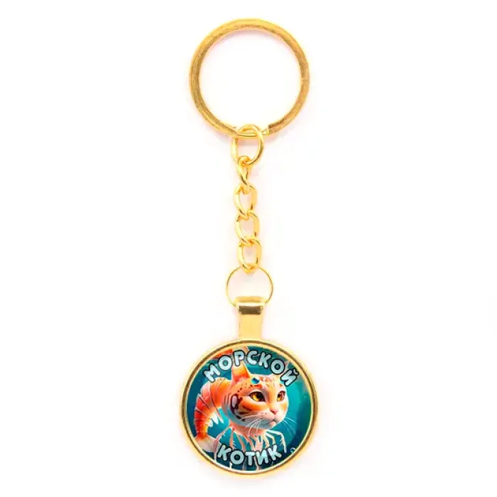 Круглый брелок из бижутерного сплава с золотым покрытием и стеклянной линзой, на цепочке.