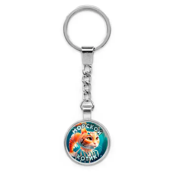 Круглый брелок из бижутерного сплава с серебристым покрытием и стеклянной линзой.