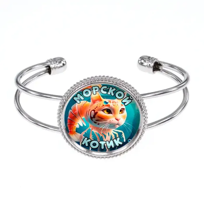 Металлический браслет в цвете серебро с декоративным элементом под стеклянной линзой.