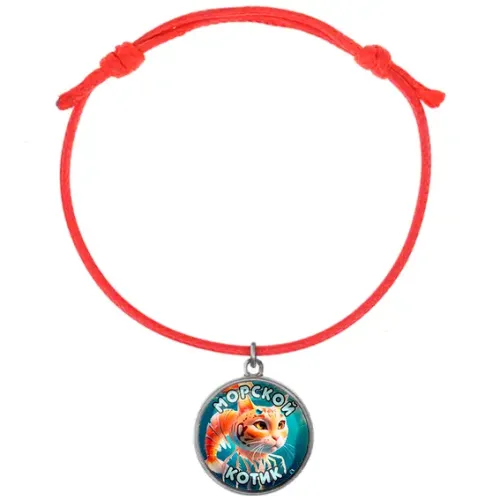 Браслет из красного шнура с металлической подвеской. Подвеска содержит полиграфическую вставку под выпуклым стеклом.