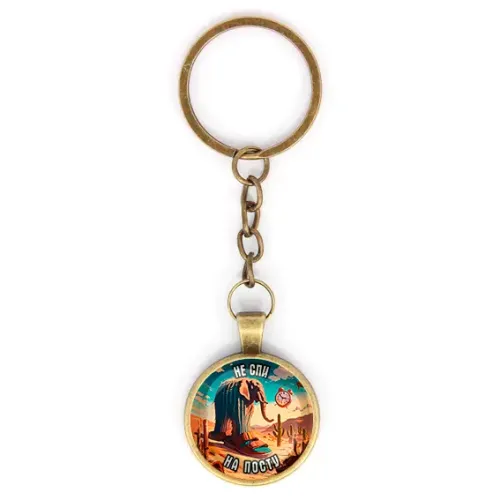 Круглый брелок из бижутерного сплава с бронзовым покрытием и выпуклой стеклянной линзой.