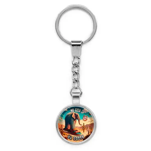 Брелок круглой формы из бижутерного сплава с серебристым покрытием и стеклянной линзой.