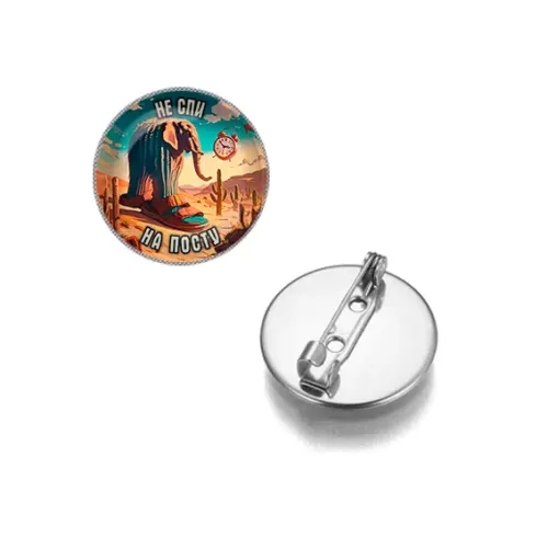 Круглый значок из бижутерного сплава с серебристым покрытием и стеклянной линзой.