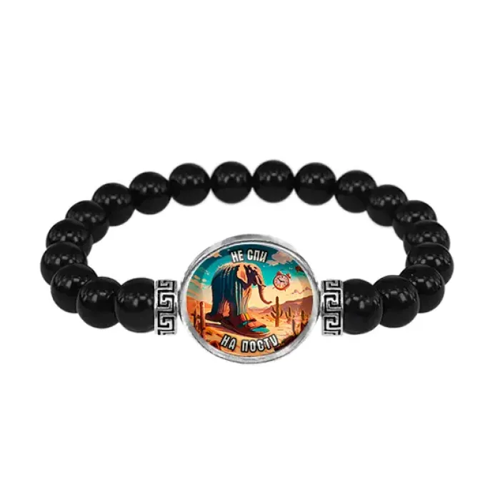 Стрейч-браслет из натурального черного агата с декоративным элементом под стеклянной линзой.