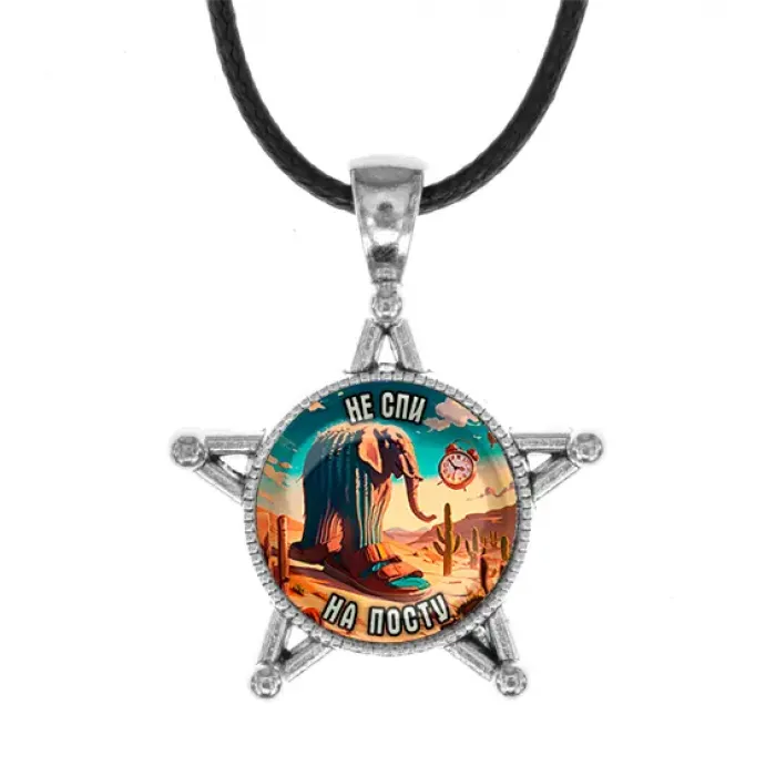 Кулон в виде звезды из бижутерного сплава под серебро со стеклянной линзой.