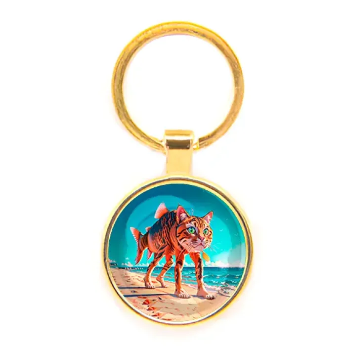 Круглый брелок из бижутерного сплава с золотым покрытием и стеклянной линзой.