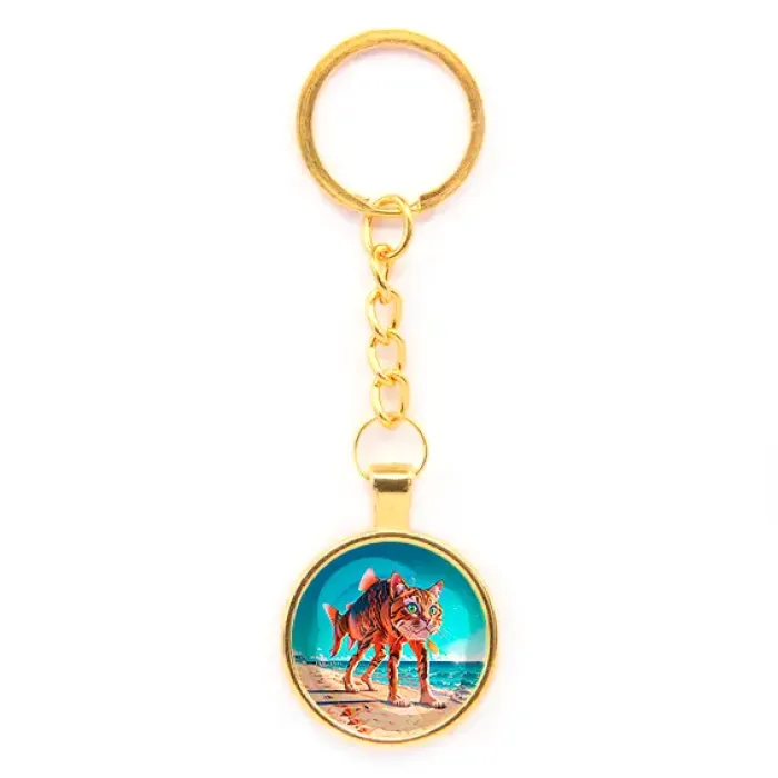 Круглый брелок из бижутерного сплава с золотым покрытием и стеклянной линзой, оснащённый цепочкой.