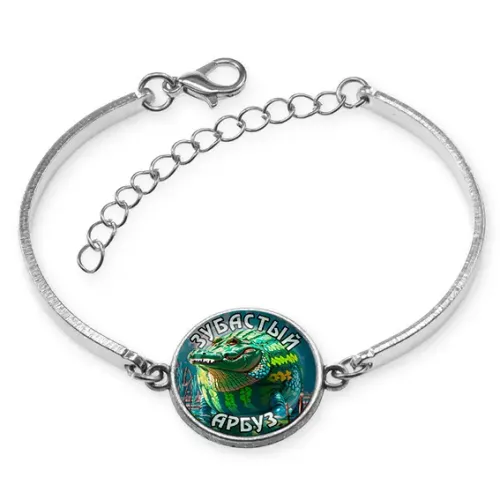 Металлический браслет в серебристом цвете с декоративным элементом под стеклянной линзой.