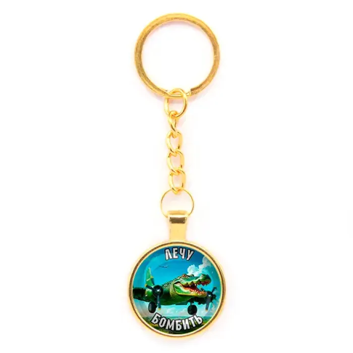 Брелок круглой формы с цепочкой, выполненный из бижутерного сплава с золотым покрытием и стекла. Дизайн модели — «Крокодило Бомбардиро».
