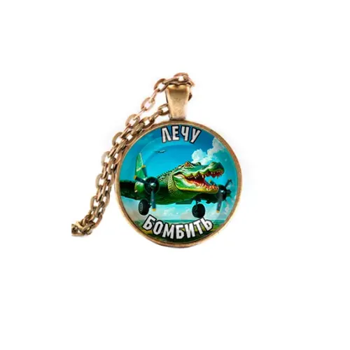 Кулон из бижутерного сплава с покрытием под бронзу и стеклянной линзой, модель «Крокодило Бомбардиро».