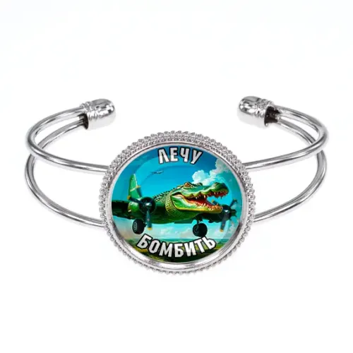 Металлический браслет с изображением крокодила и стеклянной линзой.