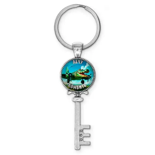 Брелок-ключ из бижутерного сплава с кольцом для ключей и изображением под стеклянной линзой.