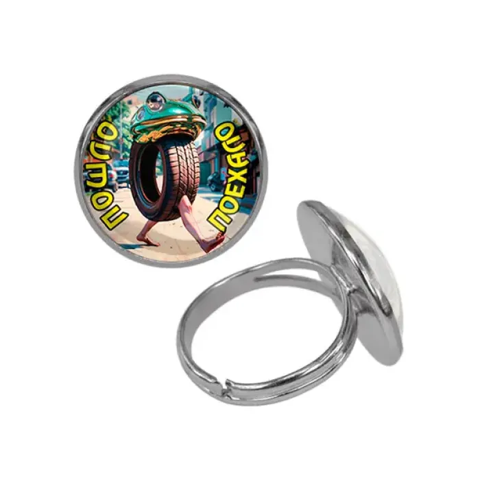 Кольцо из бижутерного сплава с покрытием под серебро. Дизайн включает изображение под выпуклой стеклянной линзой.