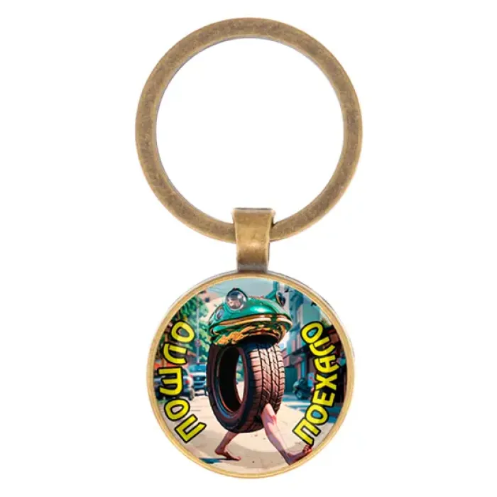 Круглый брелок из бижутерного сплава с покрытием под бронзу и стеклянной линзой.