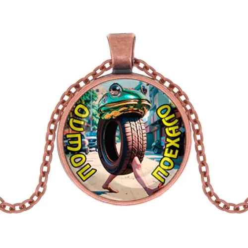 Кулон из бижутерного сплава с медным покрытием и стеклянной линзой, на цепочке с застёжкой типа лобстер.