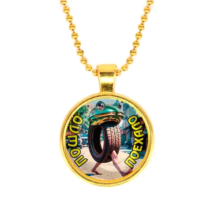 Кулон с цепочкой в золотом цвете. Изготовлен из бижутерного сплава со стеклянной линзой.