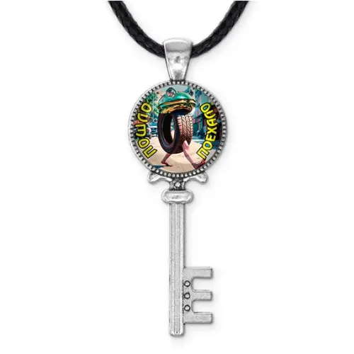 Кулон в форме ключа из бижутерного сплава со шнурком и стеклянной линзой.