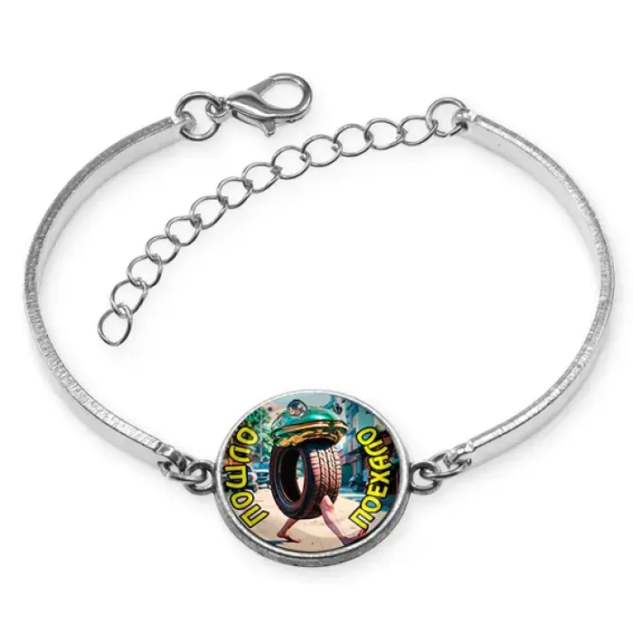 Металлический браслет с покрытием под серебро. В центре расположено изображение под выпуклой стеклянной линзой.