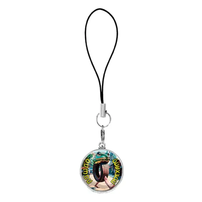 Подвеска для телефона из бижутерного сплава под серебро с изображением под выпуклой стеклянной линзой.