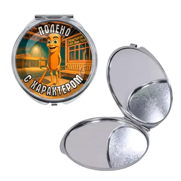Складное зеркало круглой формы из металла и стекла с полноцветным изображением на поверхности.