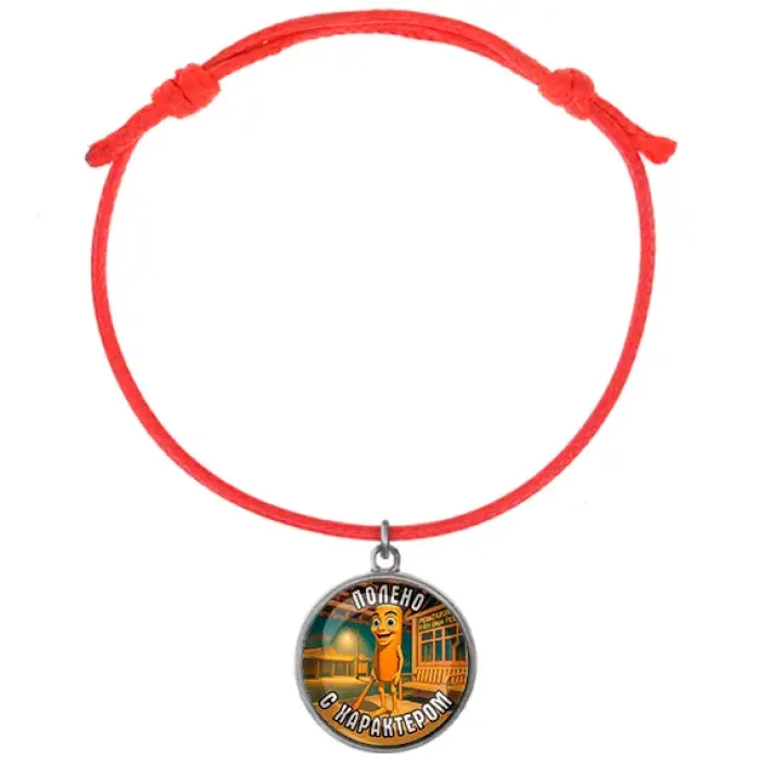 Браслет из красного шнура с металлической подвеской и полиграфической вставкой под стеклом.