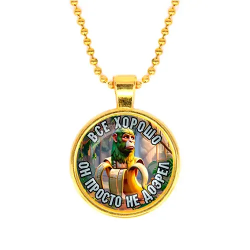 Кулон из бижутерного сплава с золотым покрытием и стеклянным элементом под выпуклой линзой.