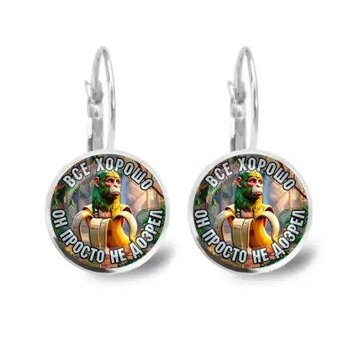 Серьги из бижутерного сплава с покрытием под серебро. Украшены изображениями под выпуклыми стеклянными линзами диаметром 18 мм.