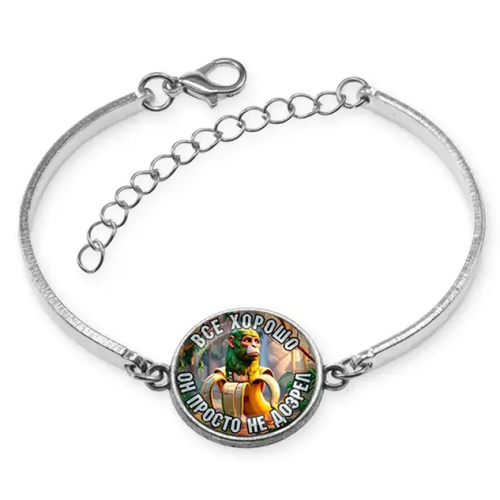 Браслет из бижутерного сплава с декоративным элементом под стеклянной линзой.