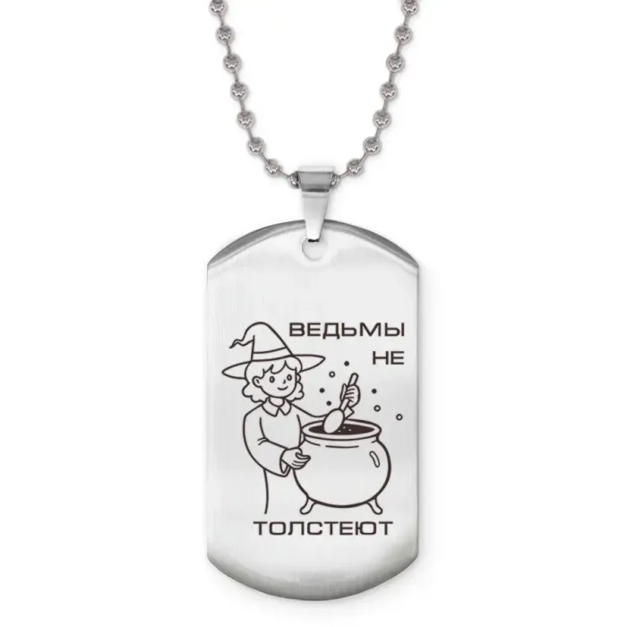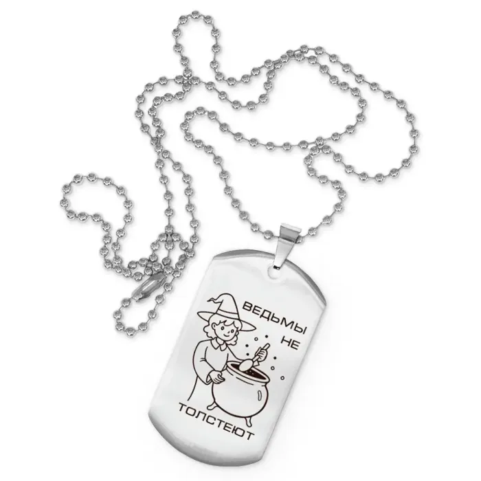 Жетон на цепочке «Ведьмы не толстеют» — сувенирный аксессуар из полированной нержавеющей стали с односторонней гравировкой.