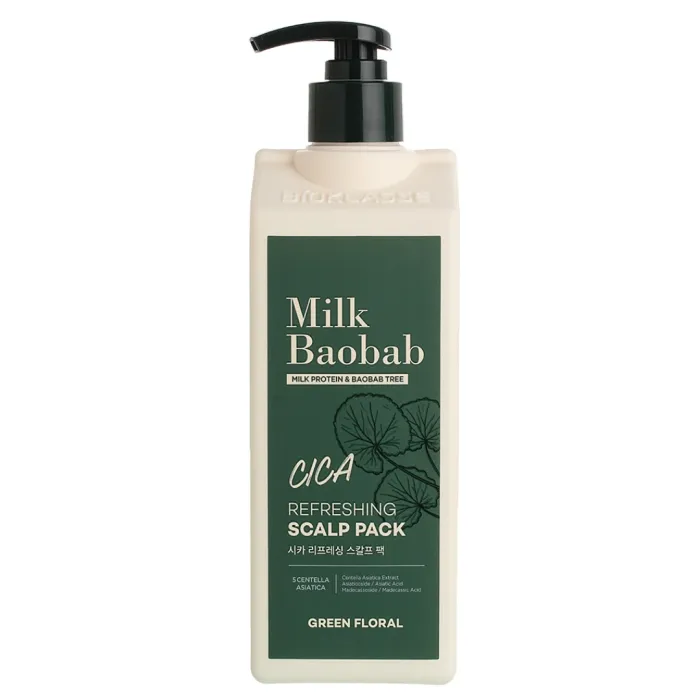 Маска для волос MilkBaobab Cica Refreshing Scalp Pack объемом 500 мл предназначена для глубокого питания кожи головы и волос. Она помогает поддерживать естественный уровень pH 5,5 и водно-жировой баланс, обеспечивая свежесть и комфорт. Продукт подходит для всех типов волос, что делает его универсальным средством в уходе за кожей головы.