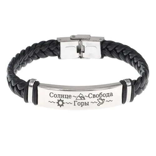 Кожаный браслет с гравировкой и плетёной структурой.