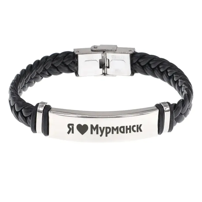 Кожаный браслет с гравировкой «Я люблю Мурманск». Плетёная конструкция.