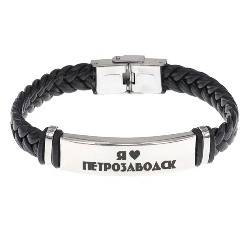 Кожаный браслет с гравировкой «Я люблю Петрозаводск». Плетёный аксессуар.