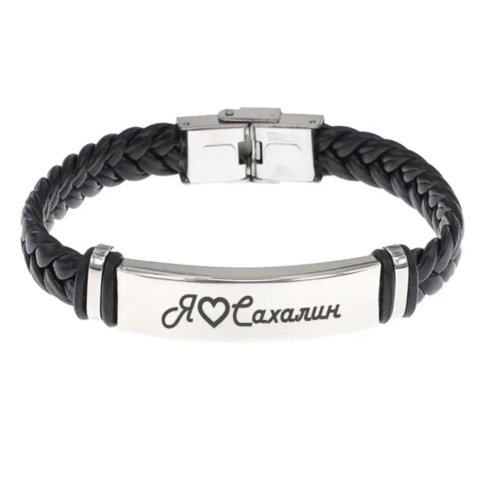 Кожаный браслет с гравировкой «Я люблю Сахалин» — сувенирный аксессуар из кожи и нержавеющей стали.