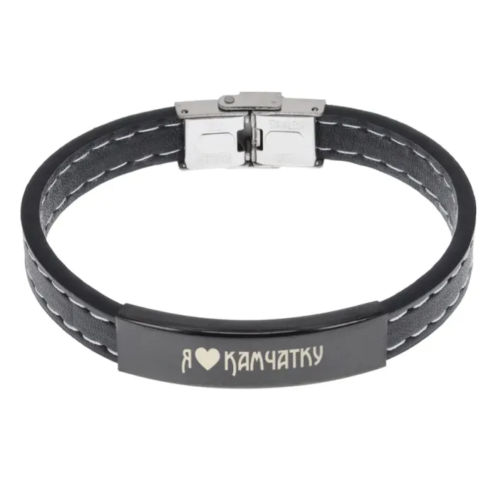 Кожаный браслет с гравировкой «Я люблю Камчатку» — сувенирный аксессуар из эко-кожи и нержавеющей стали.