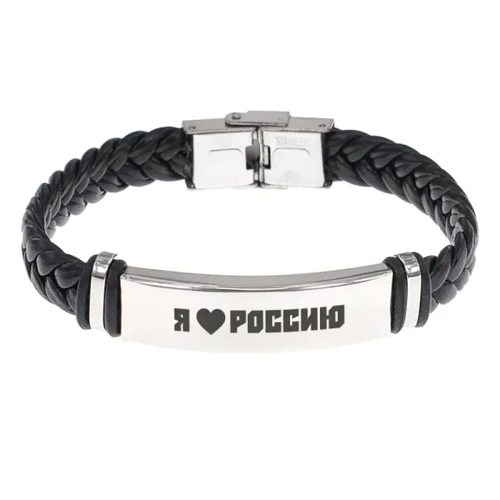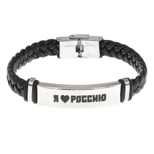 Кожаный браслет с гравировкой «Я люблю Россию». Плетёный аксессуар из кожи и нержавеющей стали.
