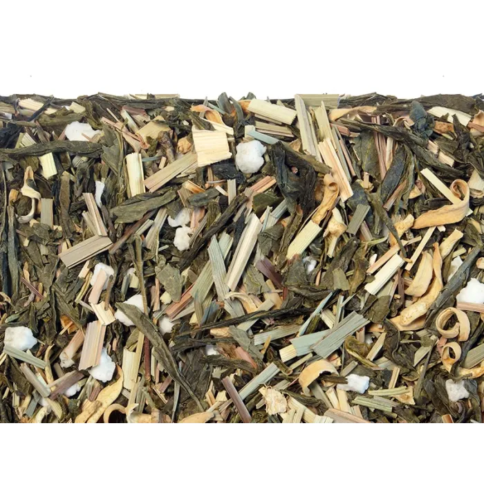 Состав: Чай зелёный рассыпной листовой крупный, лемонграсс, розмарин, цукаты лимона, кусочки имбиря, лепестки апельсина, ароматизатор