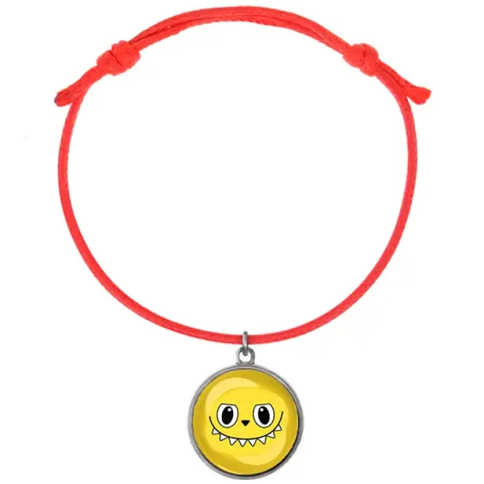 Браслет из красного шнура с металлической подвеской, украшенной полиграфической вставкой под выпуклым стеклом.