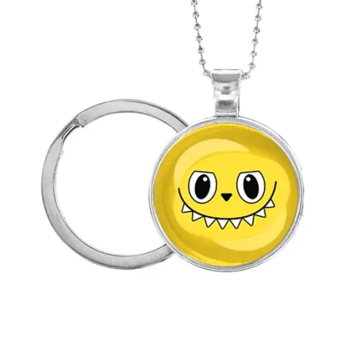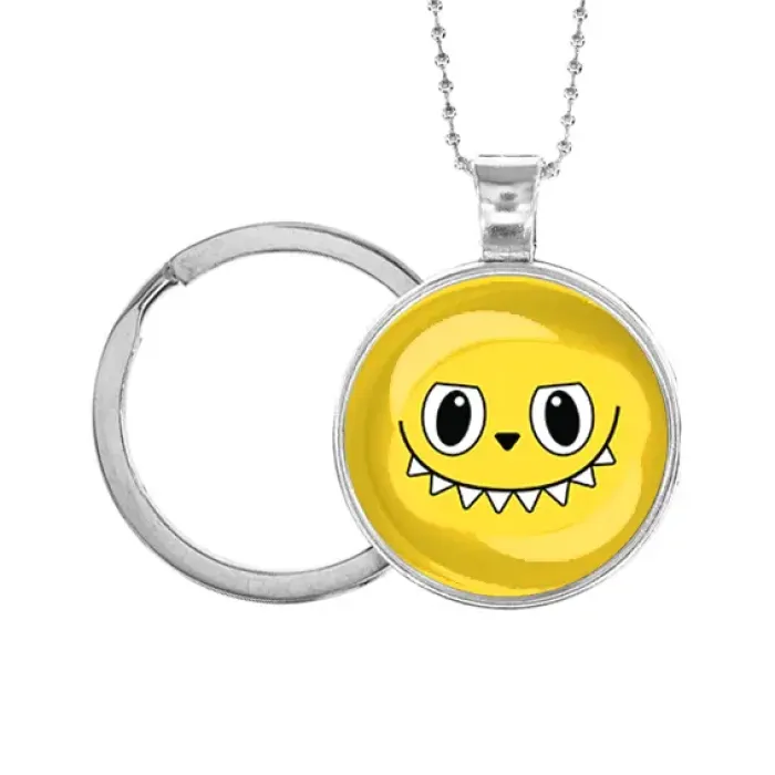 Сувенирный кулон-брелок по мотивам Лабубу из бижутерного сплава с серебристым покрытием и стеклянной линзой.