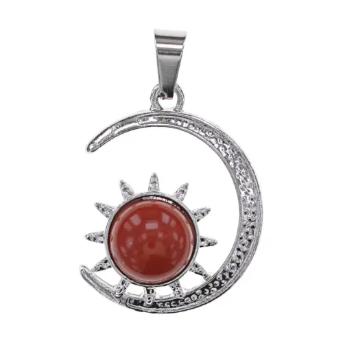 Кулон в виде символов полумесяца и солнца из бижутерного сплава с вставкой из натуральной красной яшмы.