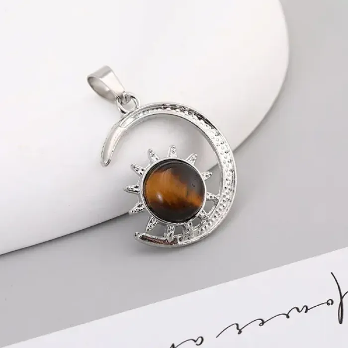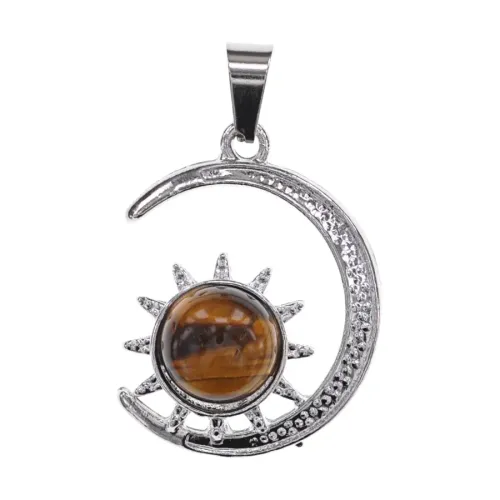 Кулон из бижутерного сплава с вставкой из натурального тигрового глаза в форме полумесяца и солнца.
