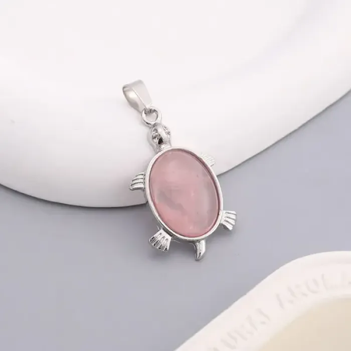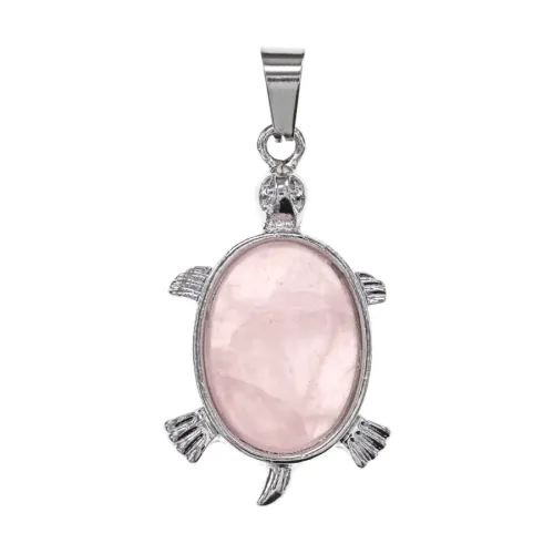 Кулон в форме черепахи из бижутерного сплава с покрытием под серебро и вставкой из натурального розового кварца.