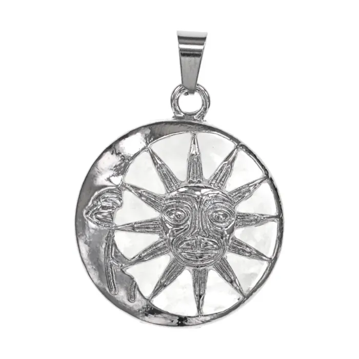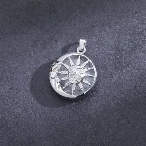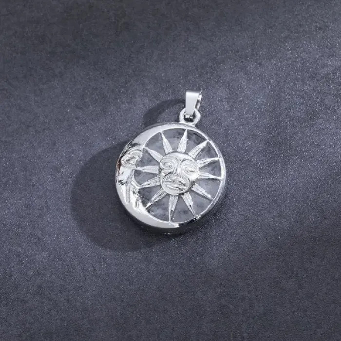 Кулон в форме полумесяца и солнца из бижутерного сплава с вставкой из горного хрусталя.