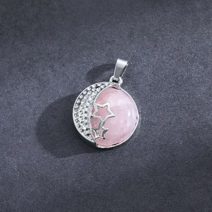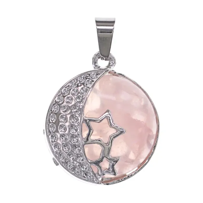 Кулон с подвеской в виде двух звёзд и полумесяца. Материал основы — бижутерный сплав, центральная вставка — натуральный розовый кварц.
