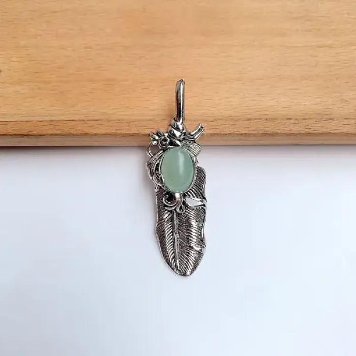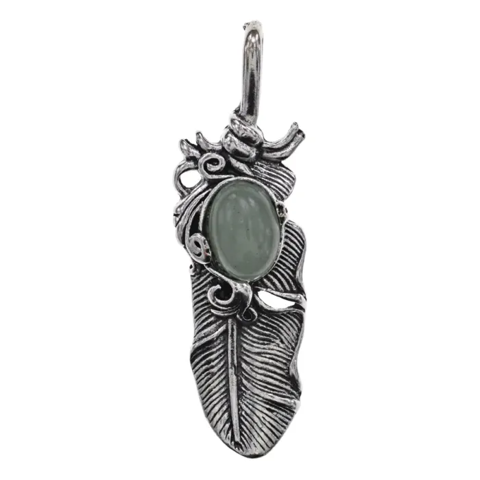 Сувенирный кулон в форме пера из бижутерного сплава с покрытием под серебро и вставкой из нефрита.